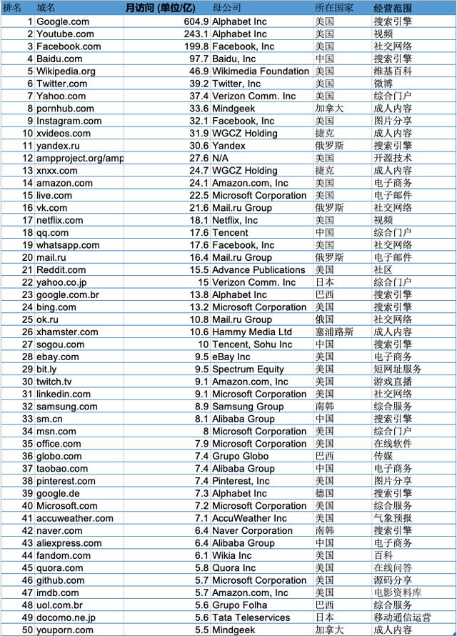 Google, Youtube, Facebook位居前三,百度擠進前五,位居第四。