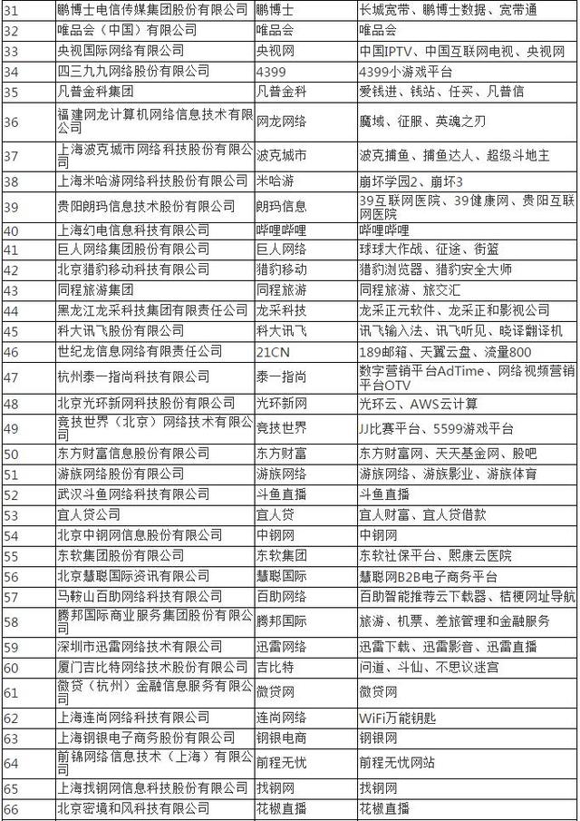 據工信部網站消息,2018年7月27日,中國互聯網協會、工業和信息化部信息中心在2018年中國互聯網企業100強發布會暨百強企業高峰論壇上聯合發布了2018年中國互聯網企業100強榜單和《2018年中國互聯網企業100強發展報告》,阿里巴巴集團、深圳市騰訊計算機系統有限公司、百度公司、京東集團、網易集團、新浪公司、搜狐公司、美團點評集團、三六零科技有限公司、小米集團位列榜單前十名。