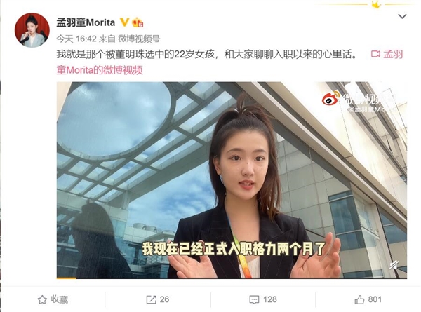 據悉,孟羽童是在綜藝節目中結實董明珠并獲得賞識,最終由實習生轉正成為董事長秘書。